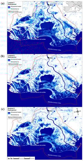 Ecosystem monitoring with replicable remotely-sensed methods offers the distinct advantage of repeated, homogeneous coverage of large areas, with little extra effort [1,2,3,4]. This allows the development of time series datasets at coherent spatial scale irrespective of site accessibility. Application of remotely-sensed techniques for wetland mapping and monitoring has received a lot of attention [5,6,7] due to this ecosystem’s decline and contribution to human well-being [8,9]. Wetland classifications have been performed with a multitude of sensors (aerial, multispectral, and synthetic aperture radar SAR) under a wide array of parametric and non-parametric statistical approaches using pixel- and object-based algorithms [5,10,11,12,13,14]. Among spectral bands, the near infrared (NIR) and red edge (RE) have been identified as the most useful for delineating wetland types [5,6,7,11,15,16], along with short-wave infrared (SWIR) bands, which are sensitive to both soil and vegetation moisture [6,17]. Thermal infrared (TIR) bands have also been used successfully to distinguish water bodies from vegetation and soil covers [6,7], as well as for identifying inundated wetlands [6,18]. With microwave bands, optimal values for incidence angles, wavelengths, and polarizations differ according to wetland vegetation types, with longer wavelengths performing better in forested wetlands [14]. What stands out from the abundant literature reviews on the remote mapping of wetlands is that, owing to the diversity of their vegetation morphologies, which are highly dynamic and often hard to discriminate from that of terrestrial ecosystems, there is no standard methodology to map wetlands on a large scale [6,19]. However, because hydroperiod is a prime factor influencing biodiversity and the services provided by aquatic ecosystems [20,21], surface water area is often used as a proxy in remote sensing to identify wetlands or estimate spatio-temporal changes in their extent [22,23,24,25].