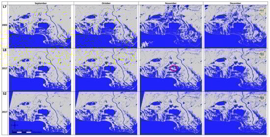 More important than the statistics is the coherence of the water maps produced with our predictive classifiers relative to “real” habitat hydrology [19]. Permanent and seasonal wetlands, as well as dry natural areas were all correctly identified based on visual interpretation and expert knowledge (Figure 1 and Figure 3). The differing management strategies (flooding durations) of embanked units were easily recognizable on the resulting water maps, similarly to hydrology of rectangular rice fields, which are flooded for four to five months a year. A strong decrease in rice cropped areas was further easily detected when comparing the maps built with Landsat 7 scenes to the more recent satellite images (Figure 3). Such decrease is in accordance with data from the French Rice Centre reporting 20479 hectares of rice in 2001 [77], compared to 11349 ha in 2017 [78]. The Landsat 7 classifier provided longer flooding durations compared to Landsat 8 and Sentinel 2 due to discrepancies in the amount of rainfall among the three periods considered (Figure 3a–c). The annual water maps were created with at least one image per month. However, given the availability of cloud-free scenes from Landsat 7 and 8, images from different successive calendar years were combined. The sum of rainfalls in the month preceding the 12 scenes corresponded to 651 mm for Landsat 7, 393 mm for Landsat 8, and 474 mm for Sentinel 2, based on data from a local meteorological station. A closer look at the September–December period, when Mediterranean wetlands are flooded again, is shown in Figure 4. The period covered by Landsat 7 (from 26 August 2002 to 31 December 2002) was characterized by strong rainfalls cumulating 328 mm compared to 67mm for Landsat 8 (from 27 August 2017 to 16 December 2017) and 89 mm for Sentinel 2 (from 27 August 2017 to 24 December 2017). These precipitations translated into the inundation of natural and agricultural systems of which the progression is easily detected on the successive Landsat 7 scenes (Figure 4). Actually, the impact of a wet month preceding scene acquisition is clearly visible when comparing scenes on a monthly basis, irrespective of the satellite used.