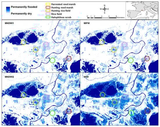 The MNDWI1 and MIFW indices could detect water in rice fields only before rice growth (area in pink circle on Figure 5) or after rice harvest (darker area in orange circle on Figure 5). Likewise, water in reed vegetation was detected only inside open-water areas of hunting marshes (small dark areas in red circle) or after reed harvest in winter (right part in the yellow circle). It appears that the MIFW index, which was developed with SPOT-5 sensors for detecting water under vegetation (used here with 0 as threshold value to improve Kappa coefficient), does not perform better than other water indices when used with Sentinel 2. The MNDWI2 succeeds partially in detecting water under vegetation, but its performance with Landsat 8 is particularly low (Table 5). Only the WIW equation provides duration of flooding that reflects real inundation patterns for all habitat types (shown in Figure 2): Water is detected similarly in non-harvested and harvested reed marsh (left vs. right part in yellow circle), demonstrating that vegetation coverage does not interfere with water detection; rice fields are considered as flooded during most of the period of rice growth (pink circle); and water can be detected under dense cover of halophilous scrubs (darker area in green circle). These plant formations, which grow in depressions that are flooded during a few winter months by rainfalls, are misclassified as permanently dry with the other three indices (Figure 5).