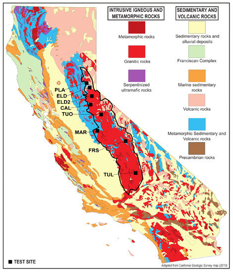 Map rock versus other land surface covers at eight test sites in the Sierra Nevada Mountains, USA