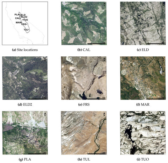 Building a surface cover classification model using remote sensing imagery of heterogeneous landscapes is challenging because spectral similarity between different classes (i.e., urban areas and bare rock, agricultural land and naturally bare soil) are common. Accurate classification of such landscapes is difficult and relies on sufficient, high-quality labels in the training data. Therefore, eight test sites from across the central Sierras were chosen to span the variety of bedrock types (e.g., granite to metamorphic), vegetation (e.g., grass to dense forest), textures (e.g., fine sands, gravel deposits, and boulders in streams), and colors (e.g., light to dark) known to exist in the area (