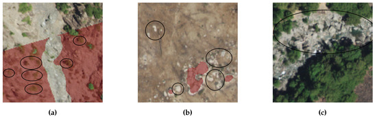 Figure 12 and limits mixed areas of rocks and trees. The accuracy was lowest in the areas at the intersection of rock and non-rock surfaces. However, this is an acceptable error that does not detract from locating rock vs. non-rock occurrences spatially.