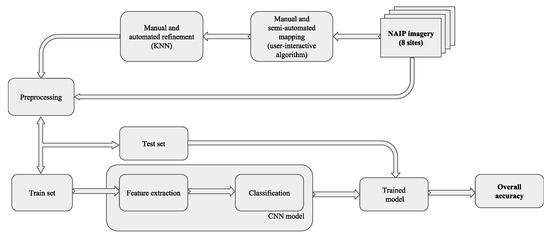 Figure 5 illustrates our workflow, starting at the upper right, with the original NAIP imagery. A combination of manual and semi-automated mapping approaches were used to classify the initial data, which was then refined using manual and automated techniques. The initial mapped data is pre-processed and split into a training (65%) and a testing (35%) dataset. The first was used to train the models, which were then run on the original NAIP imagery. The resulting predicted model values were compared with the original ground truth labels from the testing subset to evaluate the accuracy. This allowed exploration of a variety of machine learning models in order to select the best match for the original mapped test site data.