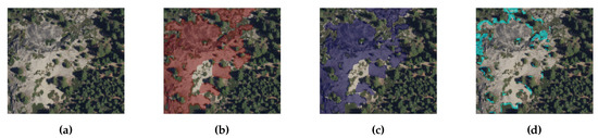 In order to confirm that the pixels were correctly labeled, rocks were visually identified by texture (e.g., more relief than adjacent gravel or soil), by color (e.g., dark, lichen-covered rocks to bright, recent exposures), and by outcrop pattern (e.g., fractured and rounded outcrops typical of glaciated granite), often checking from multiple images and angles. To help identify ambiguous features, known rock outcrops were calibrated for comparison. Between 1–7% of the pixels had to be manually corrected during this verification process. The final “bare rock” polygons outlined exposed bedrock outcrops that are in-place and devoid of soil cover. They did not include loose or mobile rock (e.g., river or talus deposits), although sub-meter shrubs or trees are often included. Lastly, for each test area, the categories were simplified to a binary mask (bare rock vs. other) to speed up training and running of the various test models.