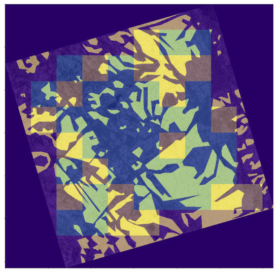 To avoid any spatial correlation between the initial mapping and the model outcome, each of the eight mapped test areas was split into non-intersecting 300 × 300 pixel squares. These squares were divided randomly into the training (65%) and testing (35%) datasets with the same label proportions (i.e., the ratio of the two classes were equal in the training and test sets). Each 300 × 300 square was split into patches using the sliding window approach to perform per-pixel classifications, as shown in
