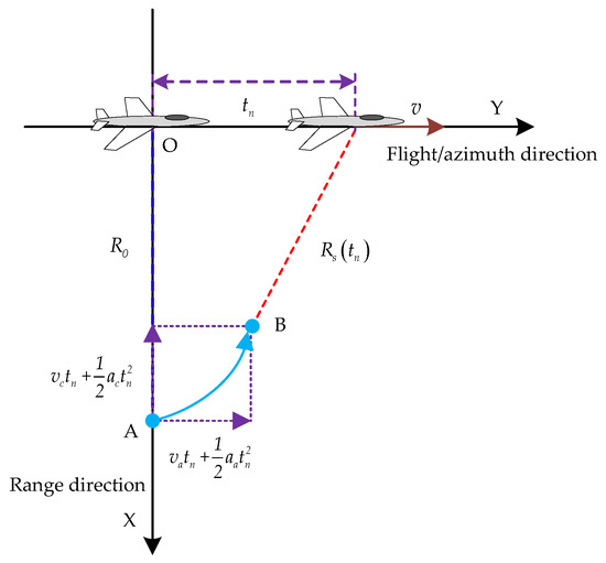 The motion geometry between the SAR platform under the side-looking strip-map mode and the ground maneuvering target on a slant-rang plane is shown in Figure 1. During the synthetic time , the SAR platform flies with constant velocity . The maneuvering target with cross-track velocity , cross-track acceleration , along-track velocity and along-track acceleration moves from point A to point B. and denotes the nearest and instantaneous slant ranges between the SAR platform and the maneuvering target. represents the azimuth slow time.
