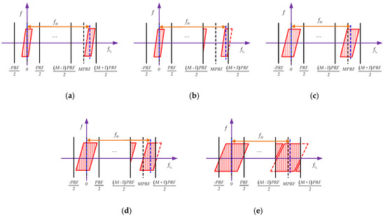 The target azimuth Doppler spectrum distribution must be further studied to obtain a well-focused result [34]. The Doppler centre shift of the fast-maneuvering target is larger than PRF/2, and the target shows Doppler centre blur. In the 2D spectrum dimension, the potential azimuth spectrum distributions caused by Doppler centre shift and DFM consist of the following cases. When , where denotes the azimuth spectrum bandwidth of the target signal, two azimuth spectrum distributions are introduced: case I: the azimuth spectrum is located entirely on one PRF band, as shown in Figure 2a, where represents the Doppler centre shift in the figure; case II: the azimuth spectrum spans over two PRF bands, as shown in Figure 2b. When , two other azimuth spectrum distributions are obtained: case III: the azimuth spectrum still occupies one PRF band, as displayed in Figure 2c; case IV: the azimuth spectrum also distributes into two PRF bands, as shown in Figure 2d. When , as shown in Figure 2e, the azimuth spectrum distributes into several PRF bands. When the azimuth spectrum does not entirely occupy one PRF band, namely, cases II, IV and V, the target spectrum split will occur; this phenomenon induces the azimuth Doppler spectrum ambiguity [34,35].