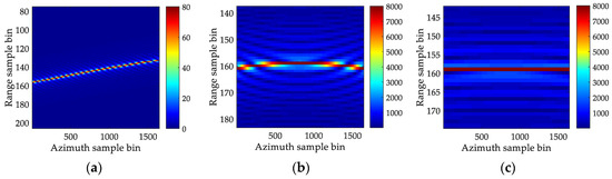 We suppose that a maneuvering target, which is denoted by Target A, is considered. The target parameters are , , and . The main radar parameters are , , , , and . The SRCM correction error is calculated as 0.486 m, which is smaller than one range resolution bin. Example A without noise is also presented. Figure 3a shows the target trajectory after range compression. The target suffers from severe RCM effect. As illustrated in Figure 3b, only the SRCM remains after FRCM and TRCM correction. Figure 3c exhibits the result of SRCM compensation by using the correction function in Equation (10). The SRCM is effectively removed, and the trajectory of the moving target is located on the same range bin. The residual SRCM correction error by using the SAR platform velocity can be ignored and the correction function in Equation (10) is considered effective for the common metre-level range resolution SAR system.