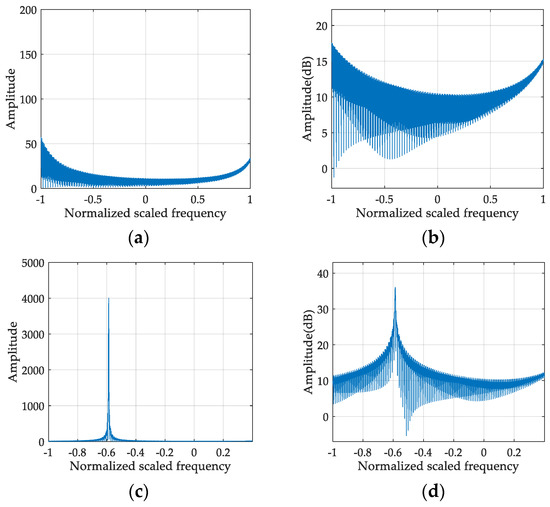 Example B without noise is provided to validate the constant factor . We consider a target that is denoted by Target B. The parameters of Target B are as follows: and . The radar parameters are the same as those of Example A. Figure 4a,b show the result using the 1D SCFT with the constant factor . The defocusing result is obtained in Figure 4a,b because the chirp rate of the signal for Target B exceeds the scope of parameter estimation. Figure 4c,d depict the result using the 1D SCFT with the constant factor . Given that the constant factor expands the parameter estimation scope, a clear peak appears in Figure 4c,d. Therefore, the results of Example B demonstrate the validity of the constant factor .
