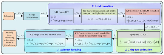 where step 1.1 is used to transform the range compressed signal into the range frequency domain, step 1.2 is applied to correct FRCM and TRCM, step 1.3 is performed to remove SRCM, step 3.1 is utilised to compensate LDFM and step 3.2 is used to obtain the final refocused result.