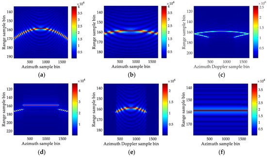 As described in the sinc function term of Equation (6), the -term induces FRCM, the -term causes SRCM and the -term leads to TRCM in the range dimension. According to the last exponential term of Equation (6), the -term, -term and -term result in Doppler centre shift, LDFM and QDFM, respectively, in the Doppler frequency dimension. The RCM and DFM are severe for fast-maneuvering targets. This condition makes the trajectory span over multiple ranges and Doppler frequency cells. Thus, the complex RCM and DFM should be effectively removed to focus the moving target.