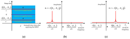As shown in Equation (23), the main part of Doppler bandwidth is removed. The Doppler bandwidth is extremely compressed. An appropriate constant factor is chosen to make the remaining Doppler bandwidth less than one PRF. The value of constant factor depends on the Doppler bandwidth of signal in Equation (9). If , then the constant factor will be chosen as . After the pre-processing step in Equation (23), the SOKT (i.e., [22,23]) can be applied to remove the SRCM. As a result, we have