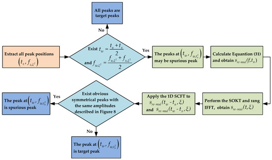 The main contributions of this work are listed as follows: (1) the proposed algorithm can achieve a well-focused result in the range–azimuth time domain because the acceleration motion and third-order phase of the fast-maneuvering target are considered; (2) the presented algorithm has low computational complexity given that it can be implemented by the fast Fourier transform (FFT), inverse FFT (IFFT) and non-uniform FFT (NUFFT); (3) two constant factors, namely, and , are introduced to expand the applicability of the proposed algorithm; (4) a new deramp function is introduced to further deal with the complex Doppler ambiguity; and (5) a spurious peak recognition procedure is presented to address the cross-term interference.