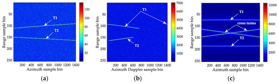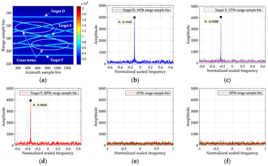 and denotes the cross terms of the signal in Equation (26). Given that the proposed method contains the nonlinear operation, the signal in Equation (26) includes auto and cross terms. According to Equations (26) and (27), the RCMs of auto terms are effectively eliminated, and only the second-order phase remains. Considering that the 1D SCFT is a linear transform, the second-order phases of the auto terms can be effectively estimated by the 1D SCFT. The matched filtering operation in Equation (18) is also a linear processing step. Thus, the auto terms can be refocused using the corresponding matched filters. With regard to the cross terms, and generally hold because , , and usually differ. Not only the second-order phases, but also the first- and third-order phases of the cross terms remain. Therefore, the RCMs of the cross terms still exist, and the energy of cross terms spreads along the range dimension. The cross terms are typically defocused in the 1D SCFT domain. In summary, the cross terms may not affect the refocusing of auto terms in this case.