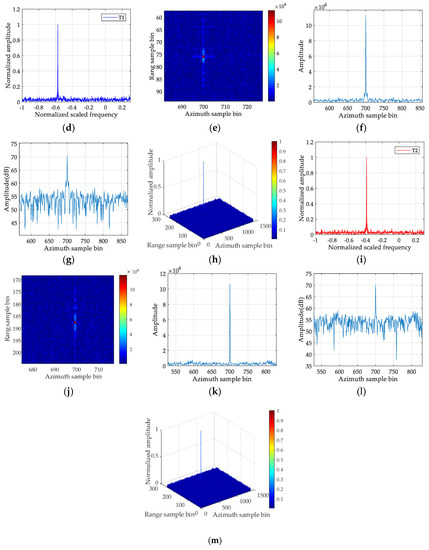 However, moving targets may have the same first- and third-order phases, namely, and , respectively, in a particular case. Therefore, the signal in Equation (26) is simplified and transformed into range and azimuth slow time domain as follows: