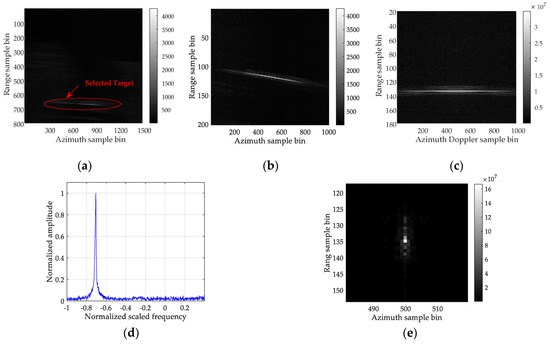Figure 17a shows the image of the selected scene, where the interested target is highlighted in the figure. Figure 17b depicts the trajectory for the target of interest after range compression. The trajectory distributes into multiple range sample bins due to the serious RCM, which indicates the typical defocusing. Figure 17c illustrates the result of RCMC in the range–Doppler domain. The target energy is focused in the same range bin after RCMC, but the effect of DFM still remains. As shown in Figure 17d, an evident peak appears in the 1D SCFT domain. According to the peak position in Figure 17d, the target can be focused by using the proposed method, as exhibited in Figure 17e. Therefore, the above-mentioned real data processing results demonstrate the effectiveness of the presented method.