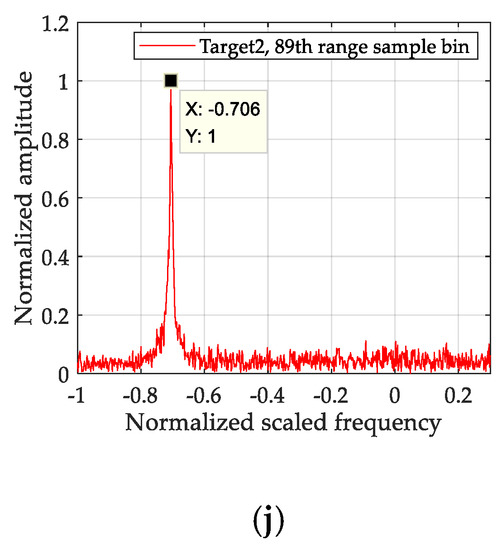 Figure 18a displays the image of the selected scene, where the two targets of interest, which are denoted by Target 1 and Target 2, are marked in the figure. Figure 18b shows the trajectories of Target 1 and Target 2 after range compression. The profile along the 420th azimuth sample bin of Figure 18b is depicted in Figure 18c,d. Two trajectories span over several range sample bins due to the serious RCM. Figure 18e depicts the result of RCMC in the range–Doppler domain. The profile along the 420th azimuth Doppler sample bin of Figure 18e is shown in Figure 18f,g. The RCM is effectively removed, but the DFM still exists. The trajectory in the middle of trajectories for Target 1 and Target 2 is a potential cross term according to the analysis in Section 4.2. Figure 18h–j illustrate 1D SCFT results of data in the 69th range sample bin (Target1), 79th range sample bin (cross term) and 89th range sample bin (Target2), respectively. Given that the peak positions in Figure 18h–j satisfy the symmetric features described in Figure 7, the peak shown in Figure 18i is preliminarily identified as a potential spurious peak. The spurious peak recognition results are shown in Figure 19a,b. The peak illustrated in Figure 18i is confirmed as the spurious peak because the symmetric peaks with the same amplitudes appear in 10th and −10th range time sample bins of the recognition function. The cross term is removed, and the focused results of Target 1 and Target 2 are depicted in Figure 19c,d, respectively. These real data processing results verify that the proposed method can be used to focus multiple targets and validate the proposed spurious peak recognition procedure.