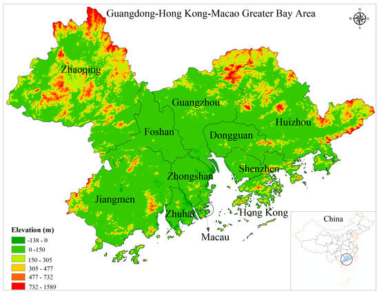 The GBA (21°32′–24°26′ N, 111°20′–115°24′ E) is located in the south of China, and it contains 11 cities (i.e., Guangzhou, Shenzhen, Hong Kong, Macau, Foshan, Jiangmen, Zhongshan, Huizhou, Dongguan, Zhaoqing, and Zhuhai). Among these cities, the terrains of Zhaoqing, Huizhou, and Hong Kong, southeast of Shenzhen and northeast of Guangzhou, are obviously undulating and mountainous (Figure 1). The highest and lowest elevations of the GBA are −138 and 1589 m, respectively. The GBA has a population of more than 66 million and a total area of approximately 56,000 square kilometers. This bay area has a large number of financial services, educational resources, manufacturing industries, high-tech industries, tourism industries, and cultural industries. Among the numerous industrial structures, Hong Kong’s economic growth is dominated by financial services; Dongguan, Zhongshan, Zhuhai, Jiangmen Huizhou, and Zhaoqing mainly depend on manufacturing industries; Shenzhen relies on high-tech industries; Macau focuses on tourism and service industries; and Guangzhou’s industrial structure is more balanced compared with other cities. The GBA is also the starting point of the Maritime Silk Road and China’s gateway to the world.