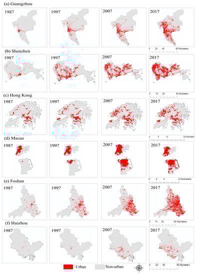 The urban areas of 11 cities within the Greater Bay Area (GBA) from 1987 to 2017.