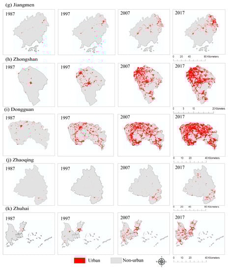 The 11 cities in the GBA experienced rapid urbanization in 1987–2017 (Figure 3), particularly Guangzhou, Shenzhen, Foshan, Zhongshan, Dongguan, and Zhuhai. Guangzhou and Foshan expanded from their original urban cores (Figure 3a,e). Except for the expansions from the original urban cores in Macau and Zhongshan, a secondary nuclear rudiment was initially engendered in the south coast for Macau and the north for Zhongshan in 1997, and the expansion of the secondary urban core areas exceeded that of the original urban cores in 2007 (Figure 3d,h). The urban areas of Shenzhen, Hong Kong, Huizhou, Jiangmen, Dongguan, Zhaoqing, and Zhuhai were distributed across the whole of the city, with many growth points and polygons around the urban cores (Figure 3b,c,f,g,i–k).