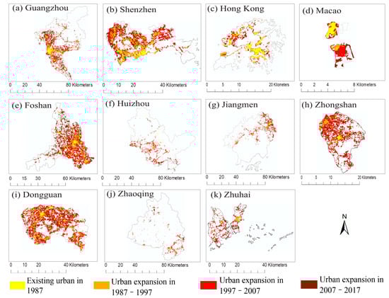 The spatial distribution of urban expansion in 11 cities in the GBA for three neighboring periods between 1987 and 2017.
