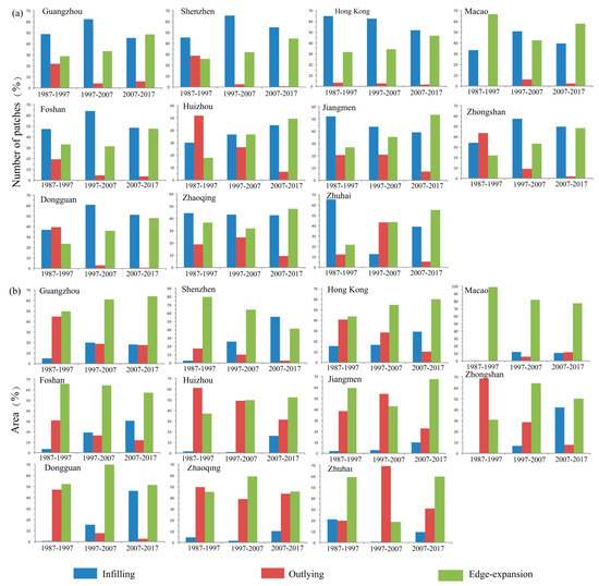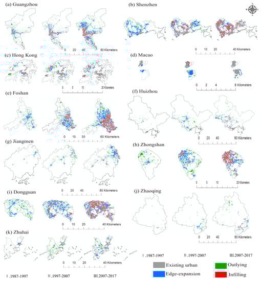 Three urban expansion types (i.e., edge-expansion, outlying, and infilling) were used to reflect the spatial patterns of urban expansion in the 11 cities (Figure 5). Regarding Guangzhou and Foshan, outlying growth patches were distributed around their existing urban areas in 1987–1997, which were transferred to the south direction for Guangzhou and the north direction for Foshan in 1997–2007; since 2007, outlying growth patches have been distributed in all directions for Guangzhou and in the north and southwest directions for Foshan. Edge-expansion growth occurred in places that were on the peripheries of already-existing urban areas, and the gaps between these areas were filled by infilling growth over time, corroborating a mononuclear polygon radiation urbanization pattern in 2017 (Figure 5a,e). For Shenzhen, Hong Kong, Huizhou, Jiangmen, Dongguan, Zhaoqing, and Zhuhai, outlying growth patches were distributed sparsely at the outskirts, edge-expansion growth occurred in places that were close to already-existing urban areas, the inside and the edges of the existing urban areas were filled by infilling growth patches, and the three types of urban expansion expanded outwards in 1987–2017, corroborating a multinuclear urbanization structure (Figure 5b,c,f,g,i–k). It is worth noting that few outlying growth patches occurred in Shenzhen, Hong Kong, and Dongguan in 2007–2017 (Figure 5b,c,i). Regarding Macau and Zhongshan, outlying growth was mainly distributed in the northwest for Zhongshan in 1987–1997, and no outlying growth occurred for Macau in this period. After 1997, the outlying growth was distributed at the outskirts and the number of patches decreased. Edge-expansion patches occurred around the initial urban cores and an increasing to decreasing trend appeared in 1987–2017. Little infilling growth occurred in Macau and Zhongshan in 1987–1997, the inside and edges of the existing urban land areas were filled by infilling growth in 1997–2017, and infilling growth patches played an important role in linking the original urban cores and the edge-expansion growth in 2007–2017 (Figure 5d,h).