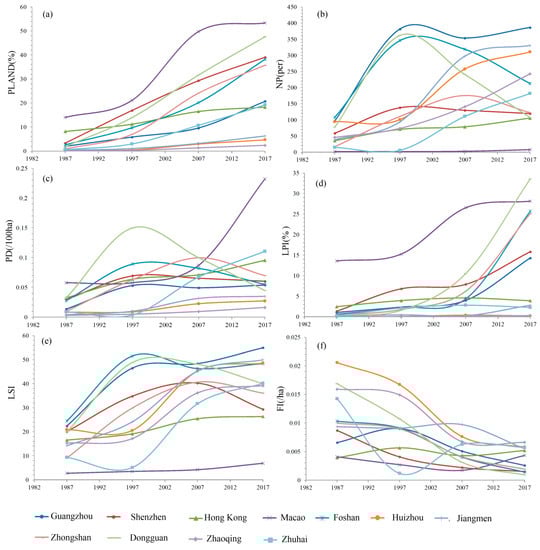 The landscape metrics for the urban land of 11 cities in the GBA between 1987 and 2017: (a) percentage of landscape (PLAND, %); (b) number of patches (NP, per year); (c) patch density (PD, per 100 ha); (d) largest patch index (LPI, %); (e) landscape shape index (LSI); and (f) fragmentation index (FI, per ha).