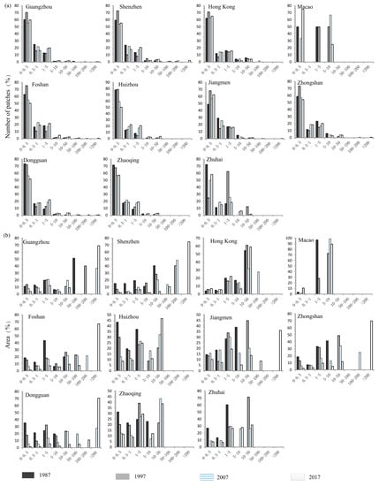 The frequency distribution of the number of patches (a) and total area (b) of urban land in accordance with eight patch size classes (unit: km2) for 11 cities in the GBA between 1987 and 2017.
