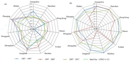 The rationality of urban expansion in 11 cities in the GBA between 1987 and 2017: (a) urban area population elastic coefficient (UPEC); and (b) urban area gross domestic product (GDP) elastic coefficient (UGEC). The farther the UPEC value deviates from the ideal line, the worse the rationality of urban expansion.