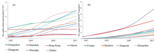The per capita urban land area (a) and per capita GDP (b) of different cities in the GBA from 1987 to 2017.