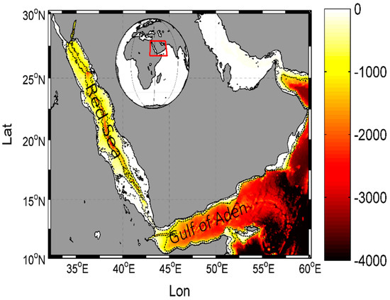 The RS and GA (Figure 1) are the extensions of the Indian Ocean (IO) in the northwestern part that connects through the Arabian Sea (AS). The RS water is very saline and dense due to a high evaporation rate, lack of precipitations, and fresh water input. The wind pattern follows the high land plateau on both sides. During the winter season, the wind converges in the center near 18°N; the northwesterly winds govern north of the convergence zone, while the southeasterly wind in the south [21,37]. During the summer season, the northwesterly wind is prominent in the entire area.