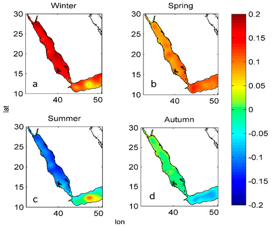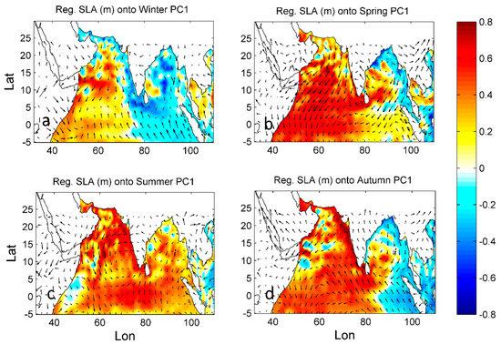 The regression maps of the SLA reveal a dipole-like pattern, a strong positive relationship (values up to 0.7) on the western side of the IO, and a relatively weak negative relationship (values up to –0.4) in the eastern side (Figure 6) in all seasons, except summer, where the positive relationship covers a wide area in the IO. In addition, there is a notable weak positive relation during winter that is associated with weak and distorted shape of wind compared to other seasons (Figure 6a) that may infer a weakening of the physical mechanism that drives the SLA during this season. Furthermore, the regression with zonal wind yields northeasterly/southeasterly flow, which directed opposite to the mean low-level circulation of IO. Meaning that, an increase of the sea level over the West IO (west of 80°E) associated with northeasterly/southeasterly wind can be seen as a possible cause for the increasing SLA in the GA and RS, as they only exchange their water masses with IO. It is well known that both sea level [43] and wind [44,45,46] over IO are closely related to ENSO via the atmospheric bridge [44,47]. Since the IO has such a basinwide response to ENSO, it is not surprising to notice the chlorophyll concentration over GA and RS has been controlled by ENSO through the northeasterly/southeasterly wind [48].