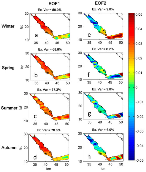 During autumn, the EOF1 showed a higher explained variance (71%) as compared to other seasons (Figure 3d). The GA loading was close to zero and it increased toward North RS. Same as that of the other seasons, autumn EOF2 was very small, and 6% was observed as explained variance (Figure 3h).