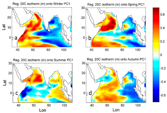 Figure 7 shows the regression of PC1 onto a thermocline depth, denoted by a 20 °C isotherm depth. The map again reveals the dipole-like pattern, with a positive relationship over the West IO and negative relationship over the East IO. The positive implies a deepening thermocline, while the negative implies a shoaling thermocline. The dipole shape of the thermocline depth shows the expected responses of the IO arising from wind-forced Rossby waves during El Niño events [49]. The slow westward propagation of Rossby waves over IO (that may takes few months) due to El Niño-induced wind stress can be prolonged after El Niño demise [50]. Here, the significant equatorial upwelling Rossby wave (negative relation) in the Eastern IO reaches its peak by splitting into two waves during winter, while it intensified during the summer and autumn seasons (Figure 7a,c,d respectively).