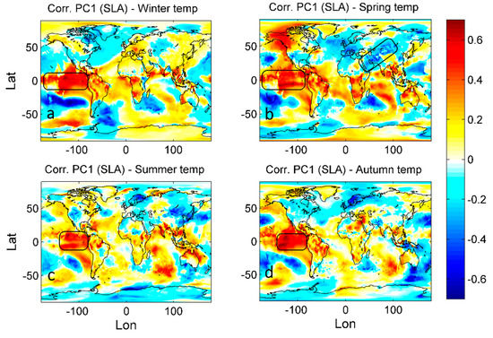 In this analysis, we constructed the correlation map between PC1 of the SLA and global 2 m air temperature to investigate whether there is a relation between SLA and any far field phenomena. Here, the air temperature was considered to be an indicator for their position and for a much wider view, either the phenomena in the sea or land.
