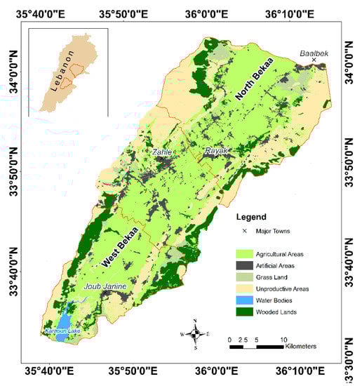 The Bekaa plain of Lebanon, which is a flat valley, is the selected study area for this study. The plain, which is shown in Figure 1, is located between 33°33′ N and 34°00′ N latitude, 35°40′ E and 36°14′ E longitude covering an area of about 860 km2. The study region is located between two natural units having very steep slopes; the eastern slopes of the Mount-Lebanon Mountains (western unit) and the western slopes of the Anti-Lebanon Mountains (eastern unit). The study site is stretched from Baalbek (characterized by semi-arid climate) to the Qaraoun Lake (characterized by the Mediterranean climate). The average annual precipitation is around 600 mm. Economically, agriculture is the main activity securing the farmers’ livelihood at the plain [24,56]. Out of the main cultivated field crops, winter wheat and potato occupy the largest areas of cultivated arable lands [57]. In November, after the first effective rain, wheat farmers launch their sowing procedure to eventually harvest in June-July the year after, occupying up to 12,000 ha annually of the plain. Over 80% of the wheat plots are supplementary irrigated. The frequency of the irrigation occurrence is linked directly with the rainfall received during the season. However, as normally the rain stops in February-March, farmers tend to irrigate for the sake of better grain yield at the end of the season. Nitrogen is the other main input to wheat. The most growth driving nutrient (Nitrogen) is supplied by wheat farmers as ammonium sulfate in amounts of up to 230 Kg/ha. However, the amounts and timing vary among farmers because of different fertilization management practices, as well as the crop rotation types.