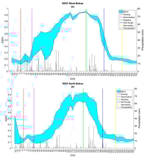 In this section, the NDVI temporal behavior of winter wheat within each part of the Bekaa plain (north and west) are presented (Figure 3). The profiles include on each date, the average NDVI ± the standard deviation of the reference plots. Through the field work, the dates of sowing and harvesting, in addition to the three phenological phases (i.e., germination, heading, and soft dough) that are the focus of this study, are observed and represented on the graphs with vertical lines.