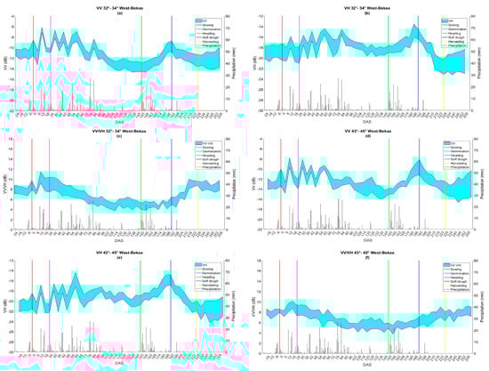 The temporal profiles of VV, VH, and VV/VH (dB) at the two incidence angles (32–34° and 43–45°) are shown in Figure 4.