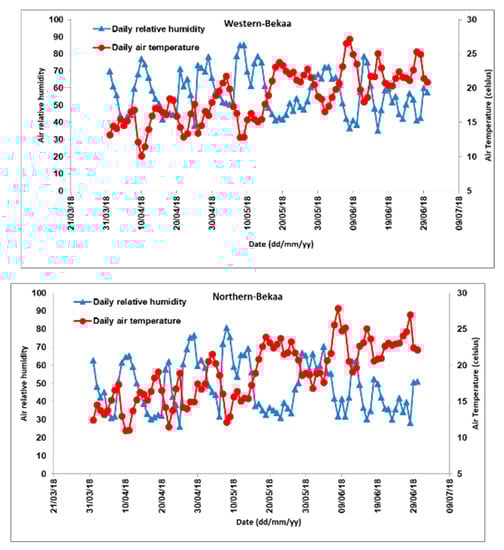 By referring to Figure 5, the difference in air temperature (Ta) and air relative humidity (RH) among both parts was seen over April, May, and June of the corresponding year (2018). In North Bekaa, the monthly averages RH for the three months were 48.7, 50.6, and 45.1, respectively. As for the west part, the RH was higher, showing values of 58.2, 58.5, and 54.1 for the same three months, respectively. Regarding the Ta, both parts witnessed similar average temperature in April of 15 °C, but slightly lower Ta in the west part for May and June (19°C and 21 °C) than the Northern part (19.3 °C and 22 °C), for the same months.