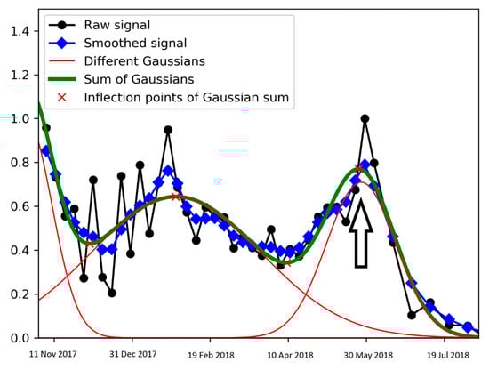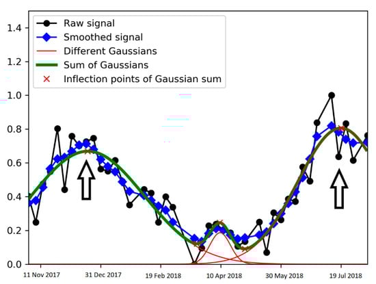 The normalized profiles (in VV, VH, and VV/VH) were next smoothed using a Gaussian filter and then modeled with the sum of Gaussian functions (up to three Gaussians):