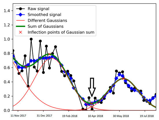 The automated method for phenology phase dates estimation was applied on S1 data. After performing the smoothing and Gaussian fitting on S1 data, the fitting output parameters were obtained automatically and used to map the three phenological phase dates as well as the harvesting date. Figure 6, Figure 7 and Figure 8 illustrate an example of the smoothed profile and the Gaussian fitting used to model the S1 data to estimate the dates of each of the phenological phases. Figure 6 corresponds to the output of the smoothing and Gaussian fitting of the VV/VH at low incidence angle (32–34°) for estimating germination and harvesting dates, Figure 7 corresponds to the output of the smoothing and Gaussian fitting of the VV polarization at low incidence angle for estimating the heading date, and Figure 8 corresponds to the VH polarization smoothing and Gaussian fitting to estimate the soft dough date, at a high incidence angle (43–45°).