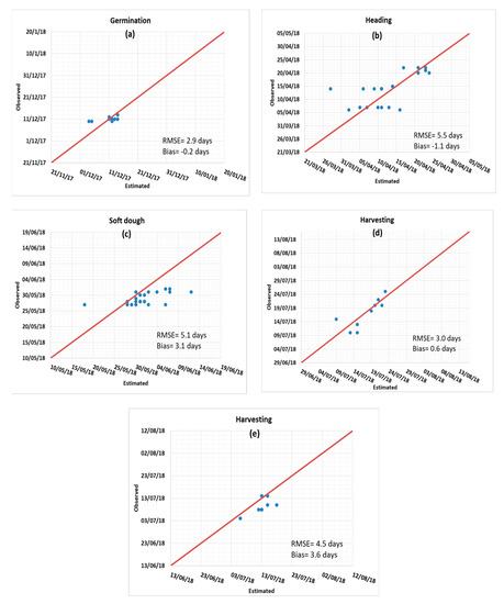 Regarding the statistical analysis, the Root Mean Square Error (RMSE) and the difference between the estimated and observed dates (bias) were calculated for each phase as follows: