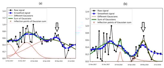 Table 3 explains the way in which the phenological phases (germination, heading, soft dough, and harvesting) were automatically detected from the Gaussian fitting. The detection of each phase is accompanied with the best S1 configuration (i.e., incidence angle and polarization). For each phase, the best SAR configurations already determined through the analysis of S1 temporal variations (Section 3.2), are considered.