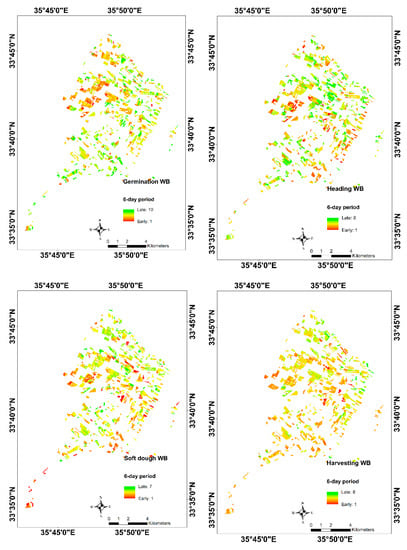 It is important to note that the whole time period for each phenological phase, in addition to harvesting, does not mean that the winter wheat in the Bekaa plain needs this relatively long time (e.g., 2 months for harvesting in North Bekaa) to achieve a particular phase. The color code bars on the maps reflect the first estimated date until the last estimated date. In the following section, the density of each 6-day period (percentage of wheat plots per each 6 days) is demonstrated.