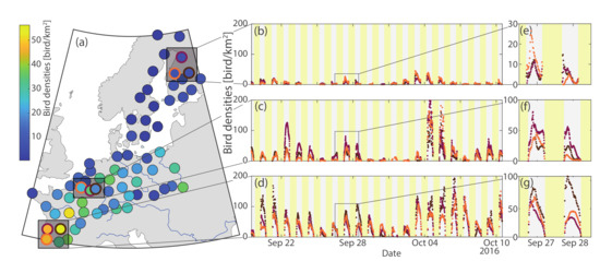 - Van Belle, J.; Shamoun-Baranes, J.; van Loon, E.; Bouten, W. An operational model predicting autumn bird migration intensities for flight safety. J. Appl. Ecol. 2007, 44, 864–874. [Google Scholar] [CrossRef]