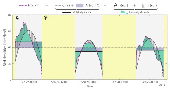 where and are deterministic trends at the multi-night and intra-night resolution, respectively, and M and I are random effects at the multi-night and intra-night resolution, respectively; is a step function that maps the continuous time t to the discrete day d of the closest night. A power transformation p is applied on bird densities to transform the highly skewed marginal distribution into a Gaussian distribution (Figure A2 in Appendix B). Figure 3 illustrates the decomposition of Equation (1) during three nights.