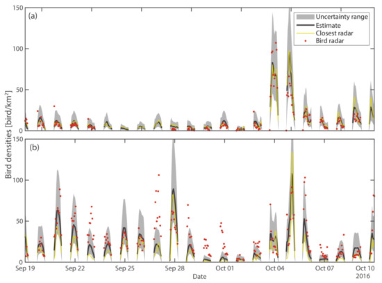 These errors translate into a RMSE of 9.2 and 19.7 bird/km2 and R2 of 0.87 and 0.73 for the radar in Herzeele and Sempach, respectively. Reference [32] reported relatively similar values of R2 when comparing the MTR of close-by weather radar and bird radar. By comparison, the nearest-neighbor approach yields a RMSE of 9.7 and 31.7 bird/km2, and a R2 of 0.85 and 0.59, respectively.