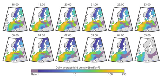 Maps of bird density estimation every hour of a single night (3–4 October). The sunrise and sunset fronts are visible at 18:00 and 05:00 with lower densities close to the fronts and no value after the front. The resemblance from hour-to-hour illustrates the high temporal continuity of the model. A rain cell above Poland blocked migration on the eastern part of the domain. In contrast, a clear pathway is visible from Northern Germany to Southwestern France.