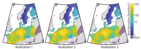 Snapshot of three different realizations showing peak migration (4 October 2016 21:00 UTC). The total number of birds in the air for these realizations was 125, 126, and 122 million, respectively. Comparing the similarities and differences of bird density patterns among the realizations illustrates the variability allowed by the stochastic model. The texture of these realizations is more coherent with the observations than the smooth estimation map in Figure 5.
