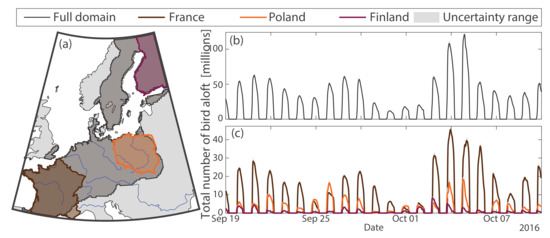 Averaged time series of birds in migration and their associated uncertainty ranges (10–90 quantiles) over (b) the whole domain, and (c) France, Poland and Finland. (a) illustrates the location and size of the three countries.
